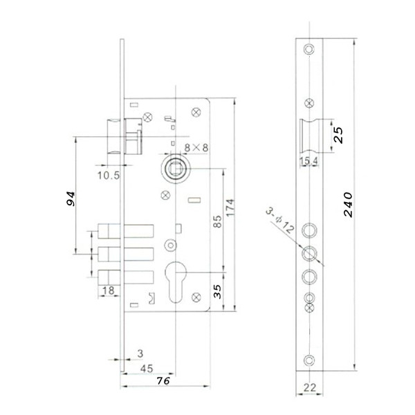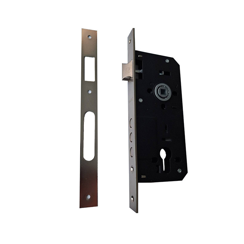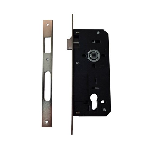 Rudas bevésőzár az ANBO-tól. 45 mm a DM méret, vagyis az előlap külső széle és a zárbetét/kilincs közepe közötti távolság. 85 mm a kilincs-kulcsközép távolság, vagyis a kilincstengely és a kulcslyuk közötti távolság. A csomagolás a bevésőzárat, a zárólemezt és a rögzítéshez szükséges csavarokat tartalmazza.