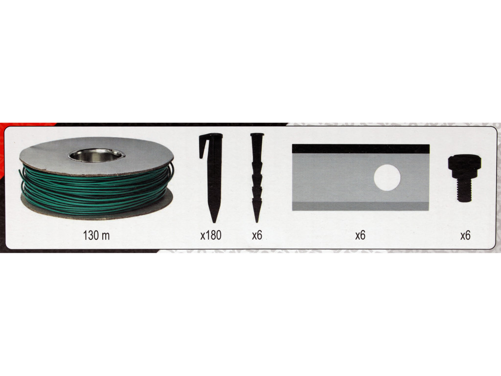 robot, töltőállomás, töltő, 130 m határolóvezeték, 180 db rögzítőcsap, 6 db rögzítőszeg, 9 db kés (3 db előre telepítve), 9 db pengecsavar (3 db gyárilag beszerelve), Védettségi fok: IPX5 (robot), IP67 (töltőállomás)