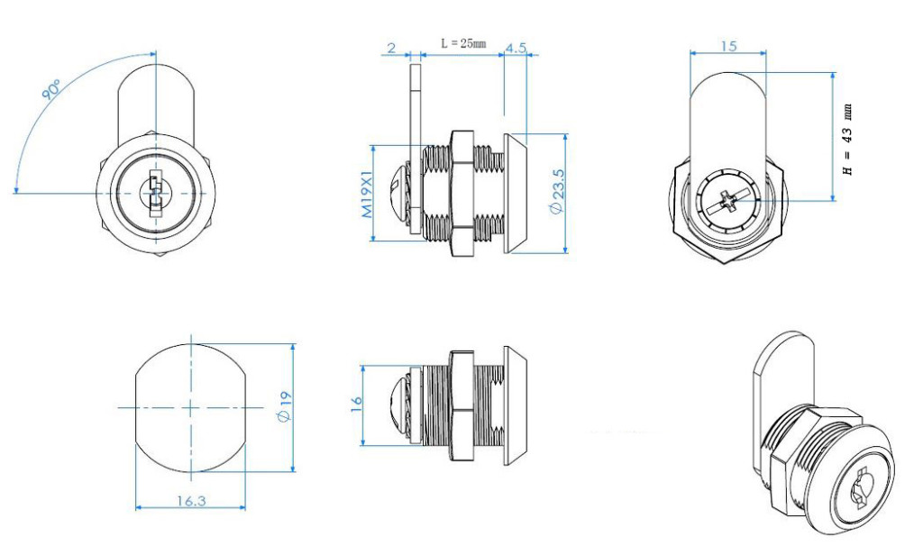 Krómozott kivitelű bútorzár, amelynek mérete 19x25 mm, a nyelv hossza pedig 43 mm, 18 mm vastagságú bútorlaphoz is alkalmas.