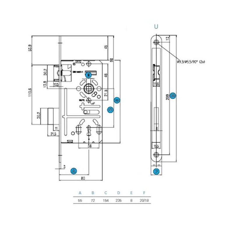 B méret - Kilincs és kulcsközép távolság: 72 mm