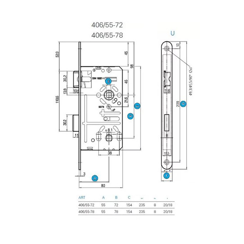 55/78 méretezéssel bíró bevésőzár melyet mint DIN zár szoktak említeni. (a méretet fentebb választhatja ki) Elsősorban a közelmúltban beépített ajtókban lehet találkozni vele. DIN furatokkal rendelkezik így átmenőcsavaros Rozettás címhez és kilincshez is alkalmas. 1 db kulccsal szállítjuk. Az ajtó tokjára kerülő ellendarab nem tartozéka, azonban a kosárba tesz gomb fölötti lenyíló menüben lehetősége van kérni hozzá.